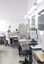 Nun wird die oberste bereits bedruckte Frontfolie mit den Tastenprägungen versehen.